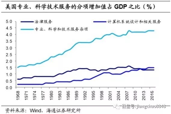 行业方面,美国上世纪中叶,制造业增加值占GDP的比重就开始下降,但80年代之后,计算机及电子产品制造行业的增加值占比不降反升,从80年代初的1.5%提高到90年代末的2%左右,2000年互联网泡沫破灭后至今仍维持在1.5%左右。同时,美国经济当中的高端服务业占比也明显提升,其中专业、科学和技术服务增加值占GDP比重从80年的3.4%提升至当前的7.1%,主要也是计算机系统设计以及相关杂项贡献。