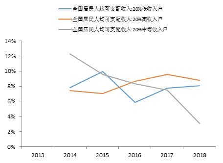 如下图中显示,占全国人口20%的高收入家庭,去年人均可支配收入增长8.8%,但同样占全国人口20%的中等收入家庭,其人口可支配收入增长率却只有3.1%,考虑到通胀因素,实际增长率几乎接近零。即便把中等偏上和中等偏下这两个组与中等收入组合并,则该大组的家庭人口要占到全国的60%,2018年其人均可支配收入的名义增长率也只有4.4%。