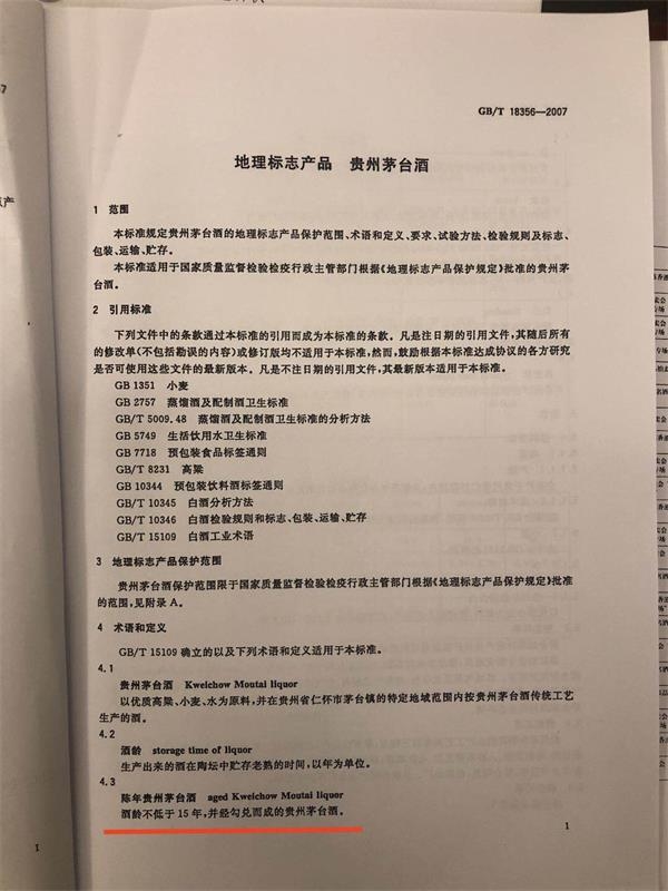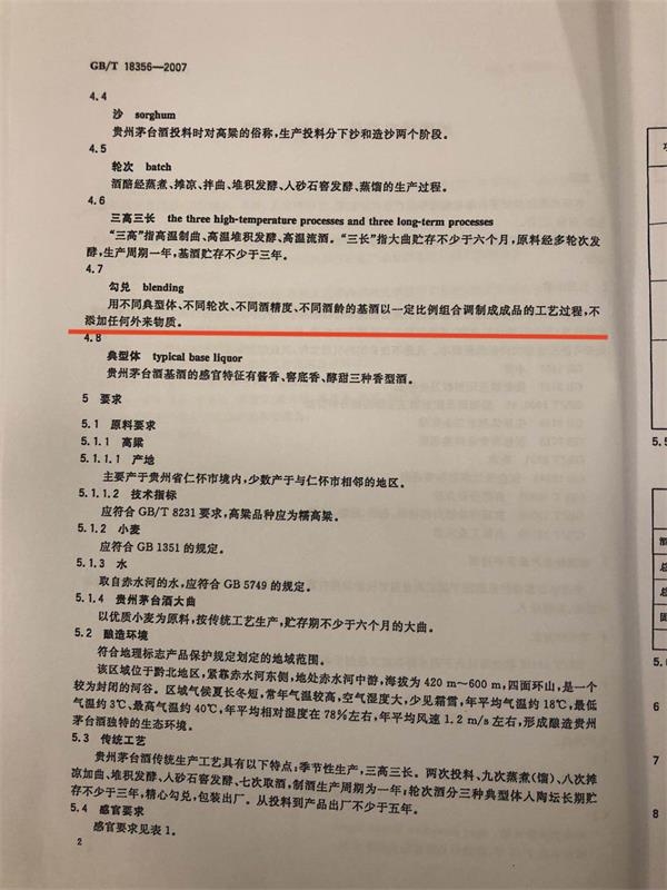 此外,贵州茅台方面还向成都高新技术产业开发区人民法院提供了“国家标准GB/T《地理标志产品贵州茅台酒》”。 根据其4.3条定义,陈年贵州茅台酒为“酒龄不低于15年,并经勾兑而成的贵州茅台酒”。其4.7条定义,“勾兑指的是用不同典型体、不同轮次、不同酒精度、不同酒龄的基酒以一定比例组合调制成成品的工艺过程,不添加任何外来物质”。