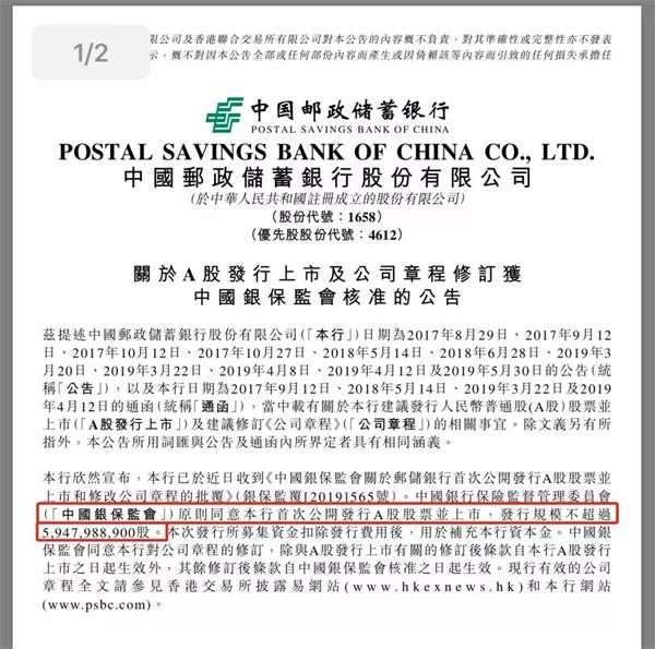 又一巨无霸归来!年度最大IPO竞争者官宣 邮储银行回归A股获银保监批复 拟发59亿股