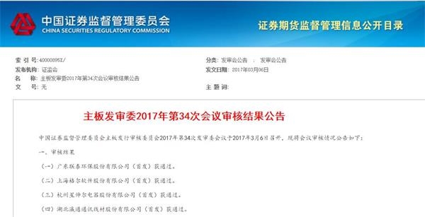 主板发审委2017年第34次会议审核结果显示,4家企业过会,广东联泰环保股份有限公司和上海格尔软件股份有限公司拟上交所上市,而杭州星帅尔电器股份有限公司和湖北瀛通通讯线材股份有限公司拟深圳中小板上市。