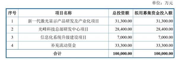 光峰科技在招股意向书中披露,本次IPO拟募集资金总投资额为10亿元,分别投向第一代激光显示产品研发及产业化项目、总部研发中心项目、信息化系统升级建设项目及补充流动资金。
