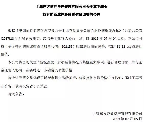 东证资管公告显示,自2019年07月04日起,公司对旗下集合资产管理计划持有的新城控股(股票代码:601155)股票进行估值调整,按照31.12元/股进行估值。本公司将密切关注“新城控股”后续经营情况及其他重大事项,进行合理评估,并与资产管理计划托管人协商,必要时进一步确定其估值价格。