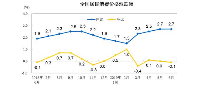 2019年6月份,全国居民消费价格同比上涨2.7%。其中,城市和农村均上涨2.7%;食品价格上涨8.3%,非食品价格上涨1.4%;消费品价格上涨3.2%,服务价格上涨1.8%。上半年,全国居民消费价格比去年同期上涨2.2%。
