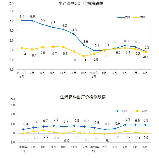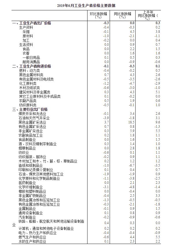 2019年6月份,全国工业生产者出厂价格同比持平,环比下降0.3%;工业生产者购进价格同比下降0.3%,环比下降0.1%。上半年,工业生产者出厂价格比去年同期上涨0.3%,工业生产者购进价格上涨0.1%。