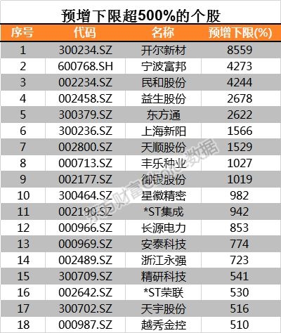 开尔新才以8559%,占据预增下限最高的宝座;其次是宁波富邦、民和股份预增下限超4000%;益生股份、东方通、上海新阳等多只股票预增下限超1000%。