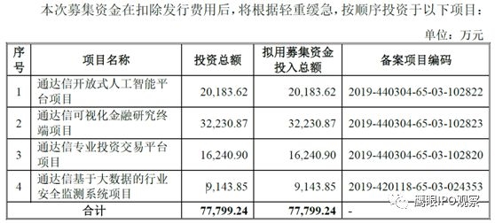 拟招股书显示,财富趋势目前总股本为5000万股,实际控制人为黄山,他持股比例为90.98%。公司本次拟在科创板发行1667万股,拟募集资金7.78亿元,募投资金主要投资于“通达信开放式人工智能平台”、“通达信可视化金融研究终端”、“通达信专业投资交易平台”以及“通达信基于大数据的行业安全监测系统”等四个项目。