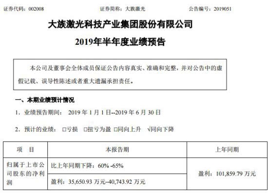 7月13日,大族激光(002008.SZ)公布的2019年半年度业绩预告显示,大族激光今年上半年实现归属于上市公司股东的净利润3.57亿元-4.07亿元,同比下降60% -65%。