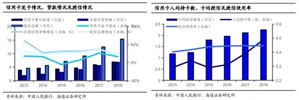 随着经济发展带动人均可支配收入的提高,叠加消费观念转变,信用卡业务得到长足的发展。根据央行发布的《2018年支付体系运行总体情况》披露,截至2018年末,信用卡(包括借贷合一卡)累计发卡数量为6.86亿张,未偿信贷余额6.85万亿元,授信总额15.4万亿元,分别较上年末增加0.98万张、1.29万亿及2.92万亿;人均持卡数为0.49张,授信使用率(应偿信贷余额与银行卡授信总额之比)为44.51%,其中人均持卡数较上年末增加0.1张,授信使用率与上年末基本持平。