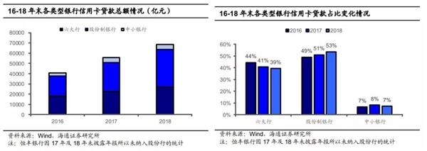 从银行类型来看,六大行及股份制商业银行信用卡贷款占总量的九成以上。我们整理了银行年报中相关信用卡数据,发现截至18年末,六大行及股份制商业银行信用卡(包括借贷合一卡)未偿信贷余额分别约为2.69万亿元和3.66万亿元,合计占18年末全市场信用卡未偿信贷余额的约93%。