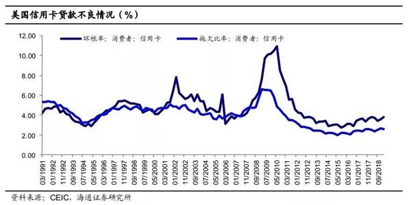 国际比较下我国信用卡不良率并不高。1)我国信用卡人均持卡量和贷款规模均较低。根据BIS数据,17年底我国信用卡人均持卡量为0.42张,而美国已达3.21张,韩国1.93张,日本2016年为2.14张。从信用卡贷款角度来看,17年底中国信用卡应偿信贷总额占金融机构境内总贷款的4.55%,同期美国商业银行信用卡贷款额占全部贷款额的比例为8.37%。2)不良率相对不高。以美国为例,其信用卡坏账率在08年危机后有一个大幅的跳升,坏账率最高接近11%,危机后回落至3%-4%的区间。19年3月底美国信用卡坏账率为3.83%,其中前100大银行信用卡坏账率为3.78%,其他银行为7.37%。相比较而言,目前国内信用卡不良率并不高。