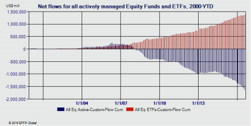 整体而言,2016年只是投资者远离主动型基金的一种延续。研究公司EPFR Global数据显示,自美股在2005年触底以来,主动型基金的资金量就持续加速流出。