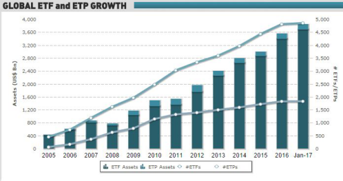 这也是为何ETF在过去八年里越来越受投资者欢迎的原因。根据EPFR Global公布的数据,2008年全球ETF资产规模为7160亿美元,而当前全球ETP(交易所买卖产品)总资产管理规模已经达到3.84万亿美元。同时,全球ETP品种已经从八年前的2200只飙升至6700只。