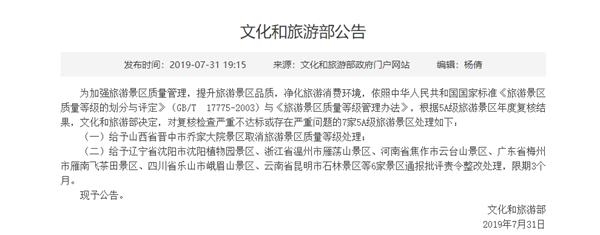 7月31日,文化和旅游部发布公告,对复核检查严重不达标或存在严重问题的7家5A级旅游景区进行处理。其中,对山西省晋中市乔家大院景区作出取消旅游景区质量等级处理。