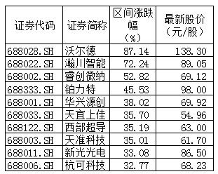 根据数据显示,7月29日至8月2日,科创板25只股票全线上涨。其中,涨幅低于20%的只有4只个股,涨幅最低的为乐鑫科技,累计涨幅10.06%。其余21只个股涨幅均超过20%,其中,涨幅在20%至30%的有10只,30%至40%的有7只,超过40%的则有4只,沃尔德以87.14%的涨幅排名第一,瀚川智能以72.24%的涨幅排名第二,睿创微纳则以52.82%的涨幅排名第三。