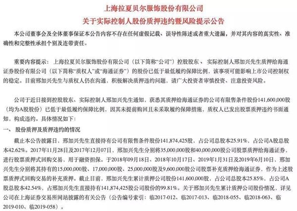 今日晚间,拉夏贝尔公告称,控股股东、实际控制人邢加兴质押给海通证券的1.416亿股A股股份已低于最低履约保障比例,因未提前购回且未采取履约保障措施,已构成违约。