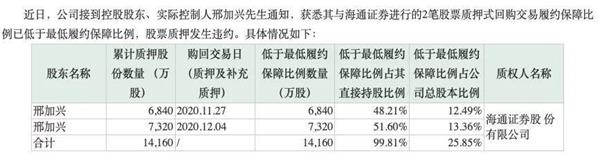 公告称,邢加兴直接持有公司股份约1.42亿股,占公司总股本25.91%,占公司A股总股本42.62%。从2017年11月至今年6月,邢加兴先后6次将所持股份质押给海通证券。