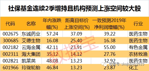 从机构一致预测目标价来看,社保持连续增持个股中,10股距目标价涨幅空间超10%,6股目标价涨幅空间超20%。伊力特目标价涨幅空间居首,超60%;江阴银行目标价涨幅空间超45%,不过该股年内仅上涨6.92%,大幅跑输沪指。另外,东诚药业、艾德生物、云海金属涨幅空间均超过20%。