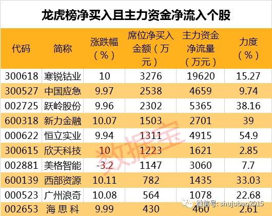 从盘口资金流向来看,主力资金净流入超千万且龙虎榜净买入个股共有9只,其中寒锐钴业、跃岭股份、恒立实业等个股资金净流入金额最大。净流入力度最大的个股有恒立实业、新力金融、跃岭股份,净流入力度分别为54.9%、39%、38.16%。