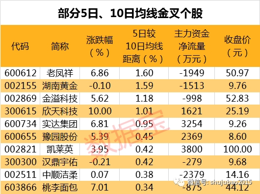 截至最新收盘,有20只A股的5日均线主动上穿10日均线,其中老凤祥、湖南黄金、金溢科技等个股的5日均线较10日均线距离最大,分别达1.6%、1.59%、1.18%。