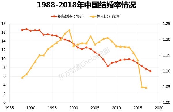 数据显示,中国登记结婚人数自2013年见顶后连续5年下降,2018年全国结婚登记人数为1010.8万对,同比下降4.9%。同时,2018年离婚登记人数为380万对,同比下降13.1%,此前连续8年增加。