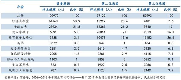 一项调查数据显示,中国育龄妇女不打算再生育的前3位原因依次是:“经济负担重”、“年龄太大”、“没人带孩子”。