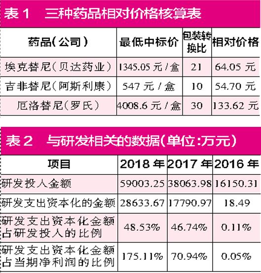 在研发费用的会计处理上,2017年以来贝达药业突然反常的以较高比例进行了“资本化”处理。2016年、2017年、2018年,公司研发支出资本化的金额分别为18.49万元、1.78亿元、2.86亿元,占研发投入的比例分别为0.11%、46.74%、48.53%。