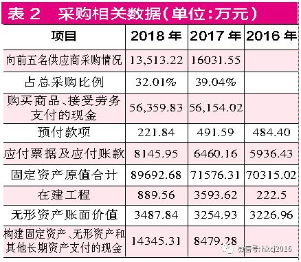 2017年和2018年,祖名股份向前五名供应商采购金额分别为21.6亿元和1.35亿元,占总采购额比例分别为39.04%、32.01%,由此推算出其2017年、2018年采购总额为4.11亿元和4.22亿元,若考虑到增值税率17%的影响,则这两年含税采购总额大约为4.8亿元和4.94亿元。