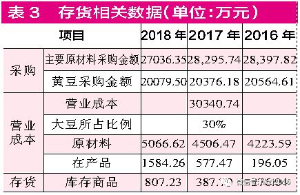 另据招股说明书中的原材料采购清单(见表3),2017年黄豆的采购金额为2.04亿元,将黄豆采购金额与营业成本中大豆的消耗金额相减,存在1.13亿元的差额,即2017年的存货中,至少应该新增1.13亿元的黄豆原材料(黄豆是大豆的一种,实际经营中也许黄豆在营业成本中的比例要略小于30%,那么黄豆原材料新增存货将更大)。可实际上,招股说明书披露的2017年所有存货账面价值仅新增了776.05万元,而且存货账面价值总共也才5471.73万元,如此就意味着单一黄豆原材料是不可能新增1.13亿元的。