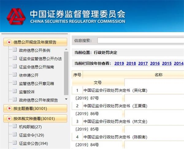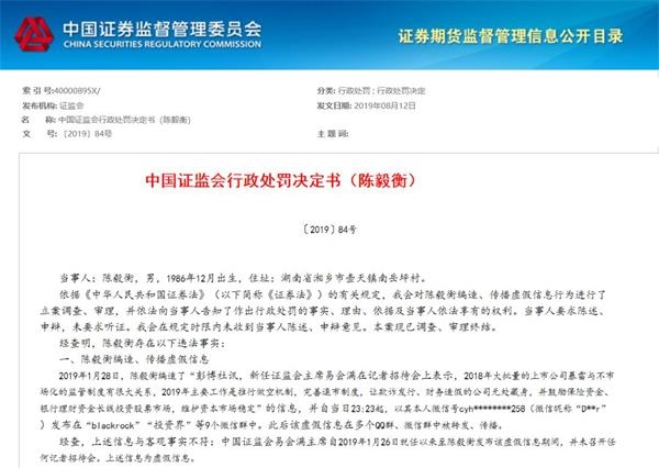 因编造、传播和证监会主席易会满相关的不实谣言,4名造谣者被处以12万——20万不等的罚款。证监会最新发布了对王夏儒、林文全、陈毅衡、吴化章等4人的行政处罚决定书,因在今年1月29日编造“证监会主席易会满主持召开记者招待会,表示2019年主要工作是推行做空机制”的消息,陈毅衡被处以20万元的罚款,吴化章、王夏儒、林文全等3人被处以12万元的罚款。