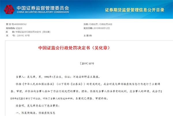 2019年1月29日09:51,新浪网财经频道实际管理和运营的新浪微博账户“新浪证券”发布涉案虚假信息。随后,涉案虚假信息被其他网络媒体、新浪微博账户等广泛传播。证监会认为,吴化章作为传播媒介从业人员,未按规定对发布信息的来源和真实性进行审核,导致发布的涉案虚假信息被广泛传播,扰乱了证券市场秩序。