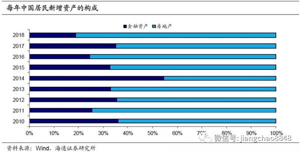 而从增量的角度看,也并非每一年的居民新增资产都是房地产占大多数。2010、2012、2014、2017年,新增金融资产的占比都超过35%、房地产比重低于65%,而2014年新增金融资产占居民新增总资产的比重达55%,首次超过了房地产的占比。