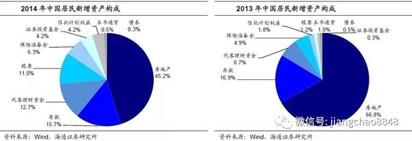 14年我国居民的新增财富减少了向地产的流入、增加了对金融市场的配置。拿13年居民新增资产的结构和14年相比,房地产的比重下降了约22个百分点,而减少的这部分比例基本都流向了金融市场相关的领域,其中,14年的居民新增财富中,股票的比重提高了10个百分点、理财提高了6个百分点、基金提高了4个百分点。