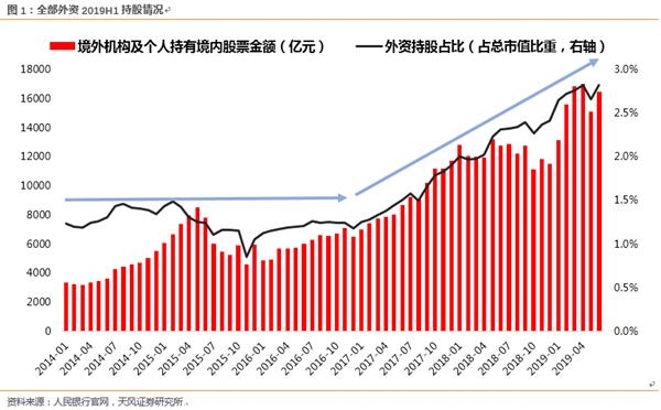 1、全部外资(北上+QFII)当前持股多少?今年净买入多少?根据央行最新披露的数据,截至2019H1,境外机构(北上+QFII)持有A股总规模1.65万亿人民币,占A股总市值2.82%。(18Q4为1.15万亿,占比2.41%;19Q1为1.68万亿,占比2.76%)。另外,根据外汇管理局的数据发布会,2019H1,外资净买入A股约550亿人民币。