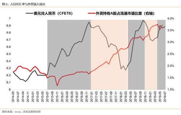 2、汇率对外资流入流出的干扰较小。自人民币汇率“破7”开始,大家担心汇率贬值导致外资流出,但从下图来看,汇率贬值与外资流入流出关联度并不高(部分原因是产品有汇率套保)。图中红色曲线代表全部外资的净流入,粉色背景是升值区域,灰色背景是贬值区域,总体来看,汇率过去两年的大幅波动,并没有改变外资持续流入的趋势。