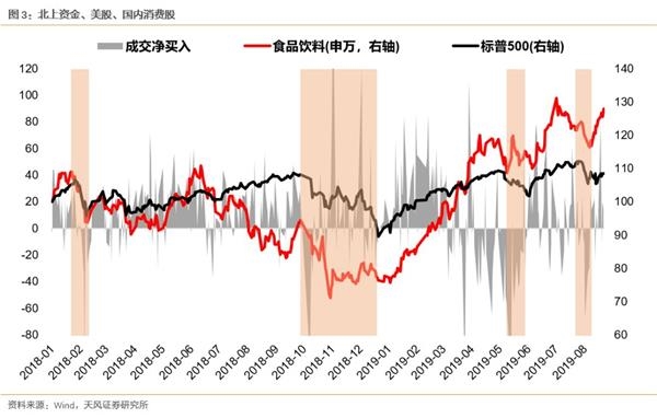 3、美股涨跌对外资的阶段性影响更大。从18年2月、18年10月、19年5月的情况来看,对于外资的阶段性影响,更值得担忧的是美股。如下图中的粉色区域,美股下跌对外资流出和国内消费股影响更显著。逻辑在于,美股的下跌往往伴随VIX恐慌性指数的抬升,全球有大量大类资产配置的基金产品,一旦VIX指数大幅反弹,便倾向于整体降低股票类资产(包括A股)的仓位,同时换成防御型的国债或者货币。