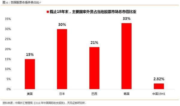 4、外资长期流入仍然是趋势,空间还很大。长期来看,外资流入的过程可能才刚刚开始,根据中国外汇管理局在今年3月发布的《2018 年中国国际收支报告》,截至2018年年底,美国外资持股占美国股市总份额的15%,日本占比为30%,巴西占比为21%,韩国为33%,而根据央行数据,截至19H1,我国的外资持股占境内流通股票市值的比例为3.73%,占总市值比重为2.82%,不仅远低于日本和美国等发达国家,还低于韩国和巴西等新兴市场国家。