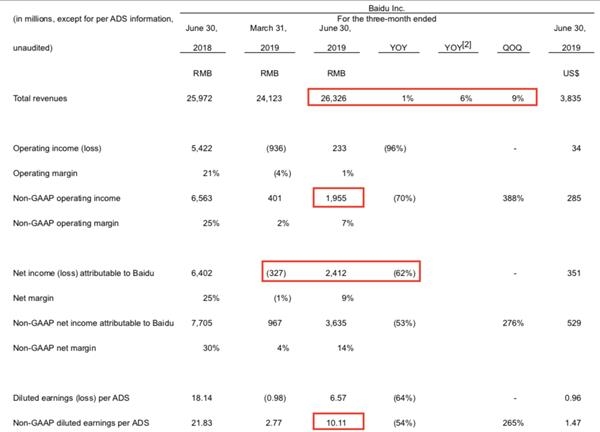 财报显示,百度二季度总营收263.26亿元,同比增长1%,不计入已经宣布的剥离交易影响同比增长6%,环比增长9%;归属于百度的净利润为24.12亿元,虽然同比下降62%,但与上季度首次出现季度亏损相比,已扭亏为盈。
