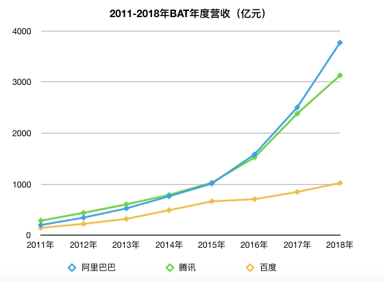 昔日“BAT铁三角”中的百度,似乎正在掉队。多年来,阿里、腾讯一直保持着较为高速的增长。从2011年至2018年,阿里巴巴的营收从200亿元增至3768亿元,腾讯则从285亿元增至3127亿元,而百度从145亿元仅仅增至1023亿元,明显低于阿里和腾讯。