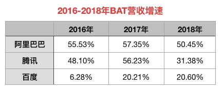 这主要是由于2015年以后百度营收增速大幅放缓。数据显示,2016年百度营收增速仅为6.28%,之后两年约20%。而最近三年,阿里营收增速均在50%以上,腾讯的营收增速分别为48%、56%、31%。