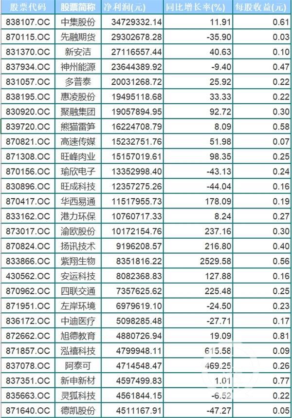 中集股份今年上半年净利润3476万元,列总额第一,每股收益第一系从事高考咨询的旭德教育,为0.81元,净利润增速第一为巨创计量为3974.2%。