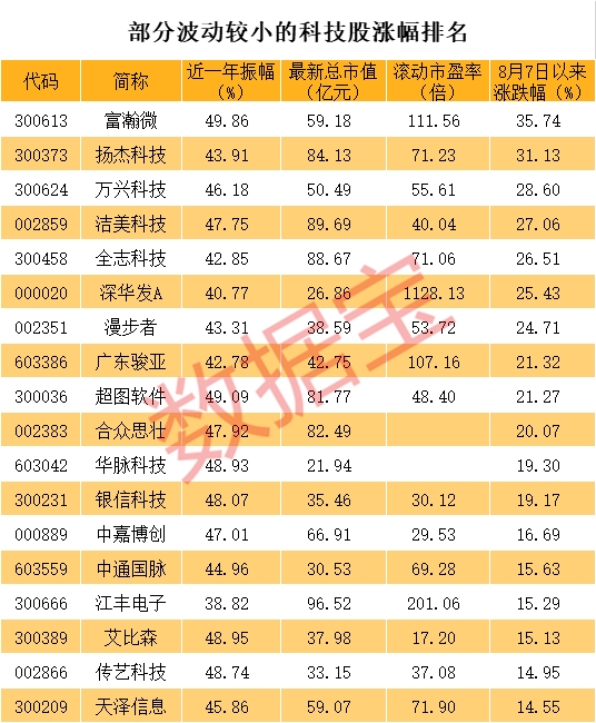 部分窄幅震荡时日已长的小市值科技股,在本轮行情中已经开始大幅突破。其中,富瀚微8月7日以来大涨35.74%,创出近一年来新高。扬杰科技位居涨幅榜次席,8月7日以来涨幅超过31%。