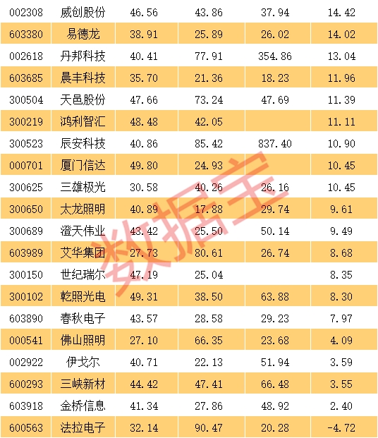 从市值角度看,太龙照明最新市值不足18亿元榜单最低;晨丰科技、华脉科技、伊戈尔等个股市值在25亿元以下。市值较高的个股则有江丰电子、法拉电子、洁美科技等。