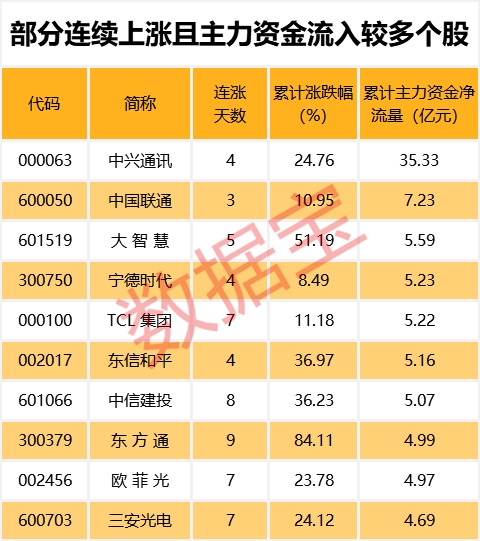 值得注意的是,802只连续上涨个股中,43只个股期间主力资金累计净流入超过亿元。其中,累计资金流入最多的为中兴通讯,主力资金累计流入35.33亿元。