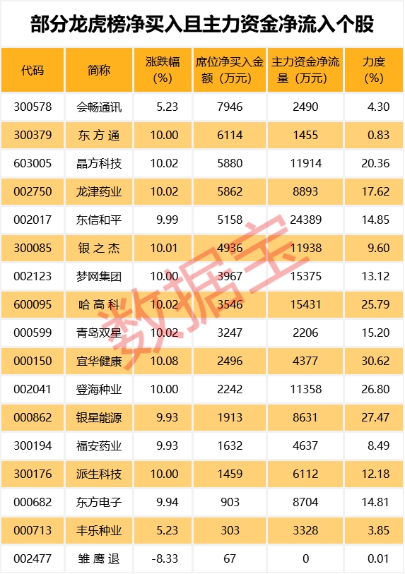 从盘口资金流向来看,主力资金净流入超五千万且龙虎榜净买入个股共有10只,其中东信和平、哈高科、梦网集团等个股资金净流入金额最大。净流入力度最大的个股有宜华健康、银星能源、登海种业,净流入力度分别为30.62%、27.47%、26.8%。
