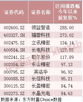 今年股价涨幅前十的苹果概念股