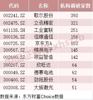 此外,东方财富Choice数据显示,机构密集调研31家苹果概念公司,其中11家公司获得50家以上机构调研。7家公司获得100家以上机构调研,分别是歌尔股份、立讯精密、工业富联、信维通信、京东方A、精测电子、领益智造。