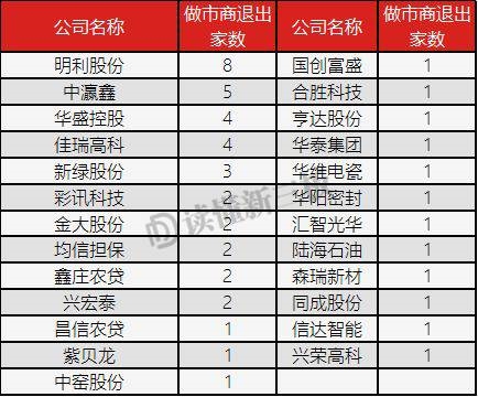 除了明利股份和中瀛鑫之外,华盛控股(430686.OC)和佳瑞高科(832244.OC)也分别有4家做市商退出,新绿股份(834632.OC)有3家做市商退出做市,彩讯科技(430033.OC)、金大股份(831003)、均信担保(430558.OC)、鑫庄农贷(830958.OC)和兴宏泰(831131.OC)则分别有2家做市商退出。
