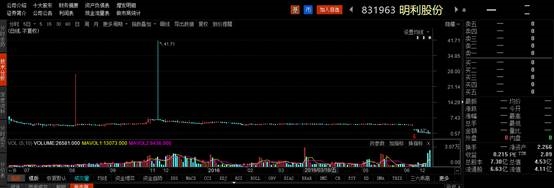 明利股份(831963.OC)是新三板的热门公司,长期出现在日成交量和成交额前10名单中。2015年6月19日公司开始做市,当日市值曾高达29.2亿元。