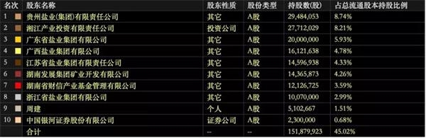 从湖南盐业2019年半年报看,十大流通股股东中,仅有一个个人股东和一家证券公司的身影。